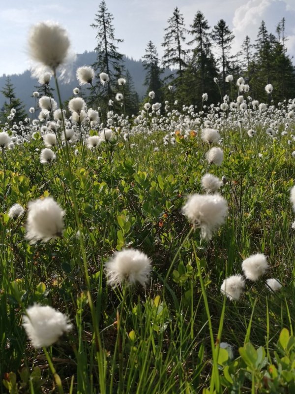 Bei einer Wiese voller Wollgras meint man auf den ersten Blick frisch gefallene Schneeflocken entdeckt zu haben. Der auffallend weiße Wollschopf wird von den langen Blütenhüllfäden der Früchte gebildet.