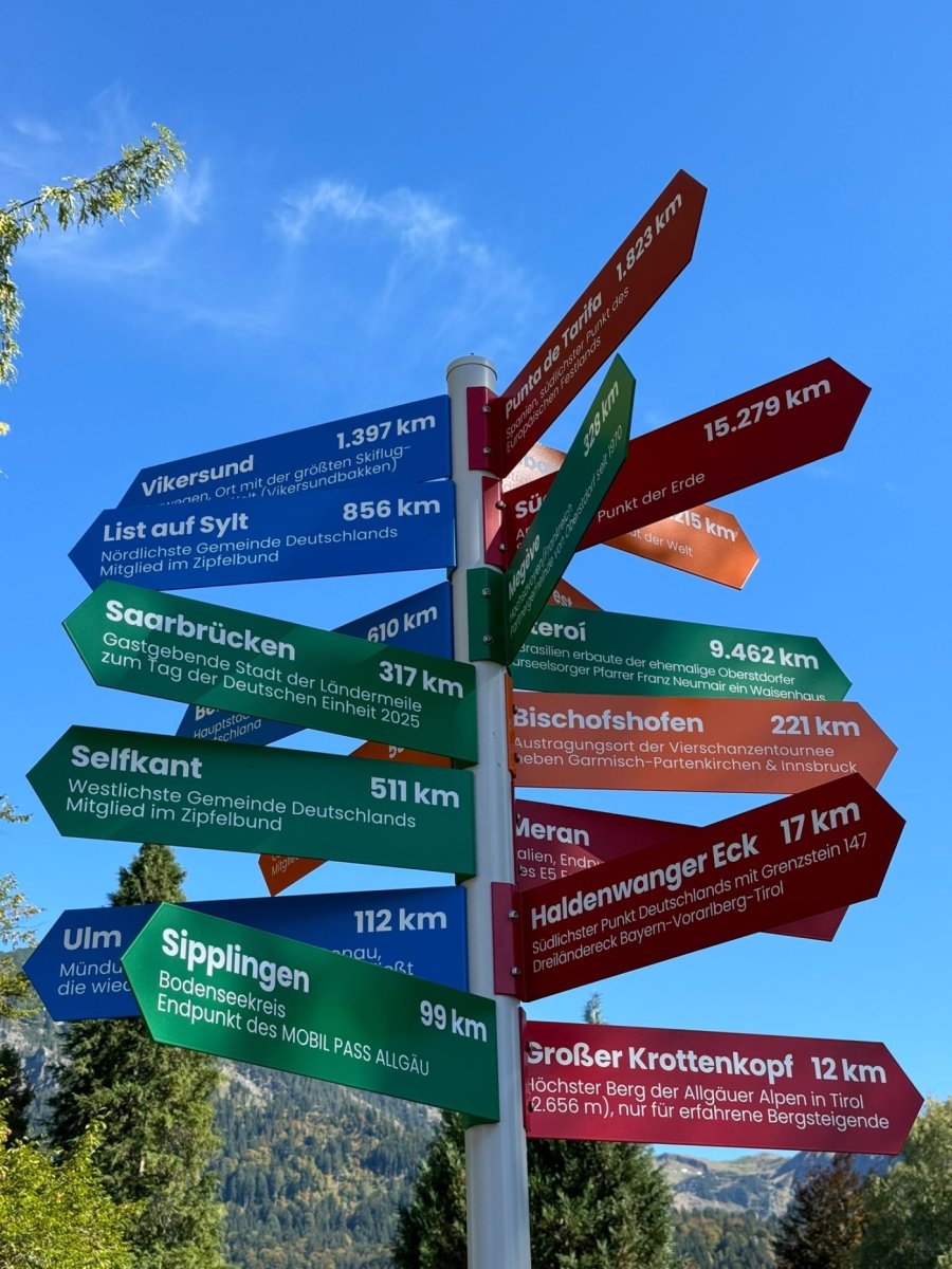Der Wegweiser zeigt nicht nur die Richtung und Entfernung zu den deutschen Extrempunkten, sondern auch zu anderen faszinierenden Orten weltweit. Hier kannst Du spannende Fakten über Oberstdorf und andere Ecken erfahren – und natürlich ein tolles Erinnerungsfoto machen! Ein perfekter Tipp für alle, die auf Entdeckungstour sind oder ein einzigartiges Souvenir-Foto mit nach Hause nehmen möchten. Schau vorbei und erlebe, wie nah die Welt in Oberstdorf zusammenkommt!