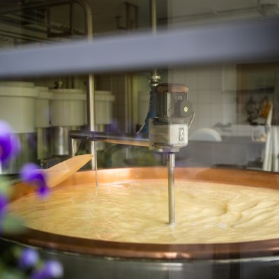 Bei unserer Ankunft erfahren wir, dass der Arbeitstag und der Rhythmus stark von den Milchkühen bestimmt werden und täglich vielseitige Aufgaben anfallen. Um 05:30 Uhr beginnt die Stallarbeit – melken, füttern, misten. Später am Morgen wird die gesamte Milch direkt zu Käse verarbeitet. Wir kommen gerade richtig, um einen Blick in die Käseküche zu werfen, wo der Käsekessel vollläuft.