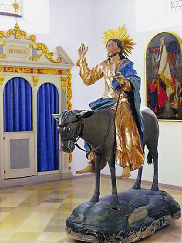 Dieser Palmesel stammt vom berühmten Oberstdorfer Bildhauer Franz Xaver Schmädl, der am 1. November 1705, also vor gut dreihundert Jahren, hier in Oberstdorf geboren wurde. Die Wirren der Säkularisation Anfang des 19. Jahrhunderts konnte der Palmesel nur mit Müh und Not überstehen, ebenso den großen Brand von Oberstdorf, wo er in der verheerenden Nacht vom 5. auf den 6. Mai 1865 in der benachbarten Seelenkapelle stand, die vom Feuer verschont blieb.