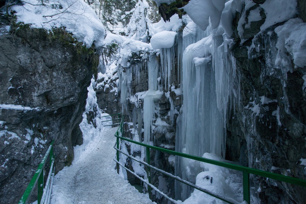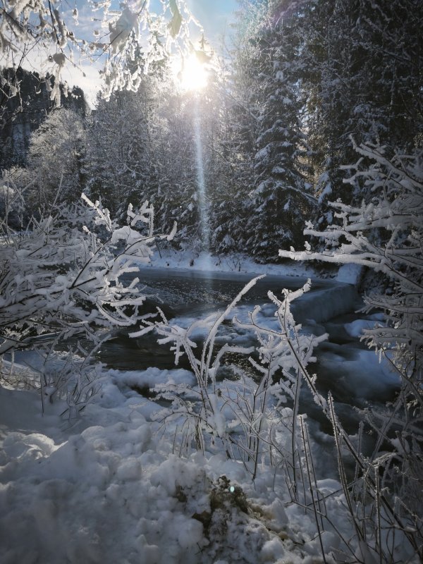 Besonders stimmungsvoll sind auch winterliche Bachläufe, deren Ufer von Schnee gesäumt sind, während das Wasser leise unter einer dünnen Eisschicht weiterfließt. Glitzernde Eiszapfen an Felsen oder Brücken, vereiste Steine im klaren Wasser oder Schneekristalle im Gegenlicht der Sonne bieten perfekte Motive für Detailaufnahmen.
