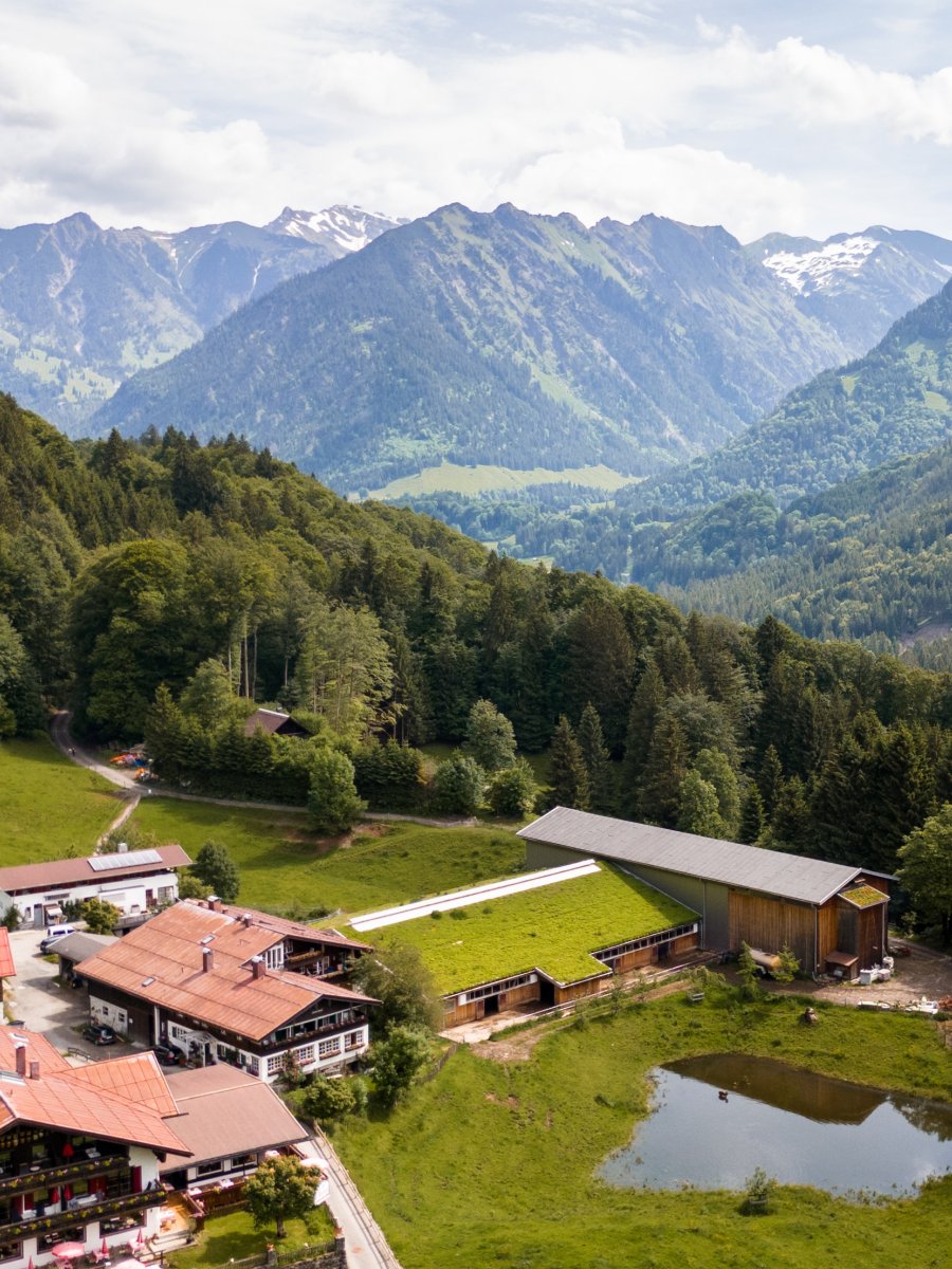 Vom Hof der Beslers schauen wir direkt auf das Panorama des Allgäuer Dreigestirns, ins Stillachtal und in die Richtung des Wandergebiets am Fellhorn. Während Ramona erklärt und oben am Wald ein Reh vorbeihuscht begreifen wir einmal mehr, dass Alp- und Landwirtschaft auch für die Offenhaltung der Landschaft, also unsere schönen Wanderwege, Blumenwiesen und Naturschutzflächen verantwortlich ist, denn ohne die Pflege der Bergwiesen würde alles zu wachsen.