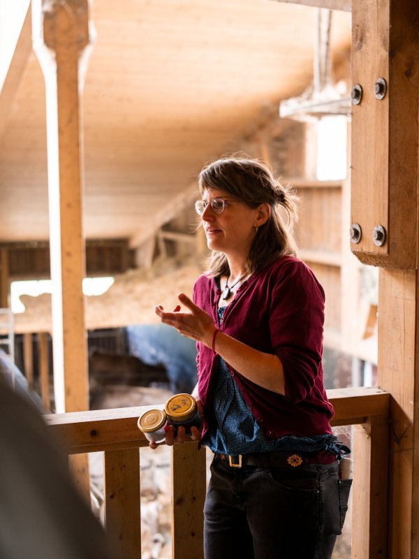 „Ich bin auf dem Dorf aufgewachsen, wo mein Opa einen Selbstversorgergarten und Kleinvieh hatte. Ich wollte immer etwas Sinnvolles tun und merkte während meines Studiums der sozialen Arbeit, dass es mir zu kopflastig war. Ein Monat auf einem Ziegenhof in Spanien erdete mich und zeigte mir die Bedeutung der Landwirtschaft. Nach meinem Studium begann ich eine Landwirtschaftslehre auf einem Demeter-Hof, verbrachte einen Sommer auf der Alp in der Schweiz und ging drei Jahre auf Wanderschaft als Landwirtin. Danach vertiefte ich mein Wissen an der Meisterschule für Ökolandbau, wo ich auch meinen Mann kennenlernte und schließlich hier am Hof landete.“