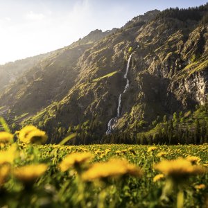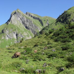 Schon manchem Wanderer, der im Abstieg den Weg verfehlt hat, sind diese Abbrüche zum Verhängnis geworden! Weiter geht es nun nach wie vor im Tal des Oybachs noch immer mäßig ansteigend über eine Schotterstraße zur Unteren Gutenalpe und anschließend zum Prinzenkreuz. Jetzt folgt das steilste Wegstück. Ein wunderbarer Abschnitt, der am Stuibenfall vorbei – dabei teilweise asphaltiert – weiter stramm aufwärts bis zum Ziel an der rund 1.400 Meter hoch gelegenen Käseralpe leitet. Von hier aus hat man dann eine traumhafte Aussicht auf die berühmte Gratschneide des „Rädlergrates“, die kühn geschwungen hinauf zum Himmelhorn am Schneck verläuft!