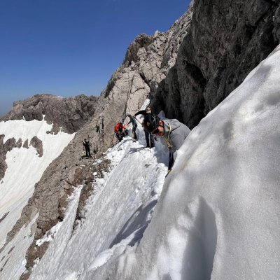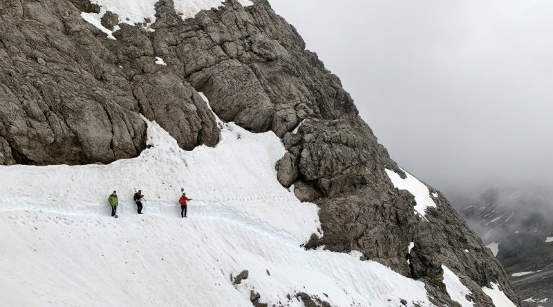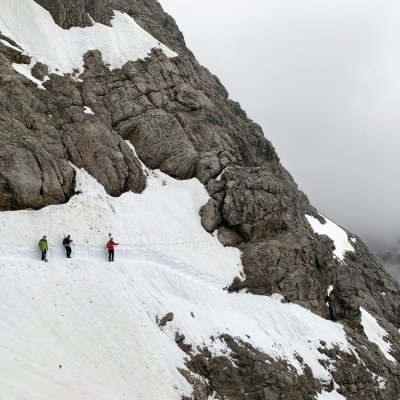 Damit die hochalpine Tour im Frühsommer bald schon gut zu begehen ist, heißt es jedes Jahr: Auf geht’s zum traditionellen Ausschaufeln des Heilbronner Wegs! Das ist nötig, denn ein Teil des Höhenwegs liegt im Schatten, und dort bleibt der Schnee sehr lange liegen. Die Zuständigkeit liegt in Händen der DAV Sektion Heilbronn und ihrem Wegewart Rolf Maier, doch einer, der schon seit 20 Jahren tatkräftig mithilft, ist Bergführer Andi Tauser von der Alpinschule Oberstdorf, der als Privatmann einen Teil dieser Arbeit organisiert. Meist treffen sich dann Mitte Juni – mitunter kann es auch etwas früher sein – an einem Freitag acht bis zehn Leute, um am Wochenende überall dort entlang des Steigs in den schattigen Zonen Schnee wegzuschaufeln, wo die Sonne ihn noch nicht beseitigen konnte! Denn während im Tal schon keiner mehr an Schnee denkt, bleiben in den Höhenlagen noch sehr lange Altschneereste und -felder zurück und können zur Gefahr werden. Die betroffenen Passagen des Bergpfads müssen entweder schneefrei gemacht oder der Schnee zumindest eingeebnet und somit deutlich entschärft werden. Das heißt aber auch, dass man trotzdem wissen sollte, wie man sich auf einer Schneeunterlage sicher bewegt.