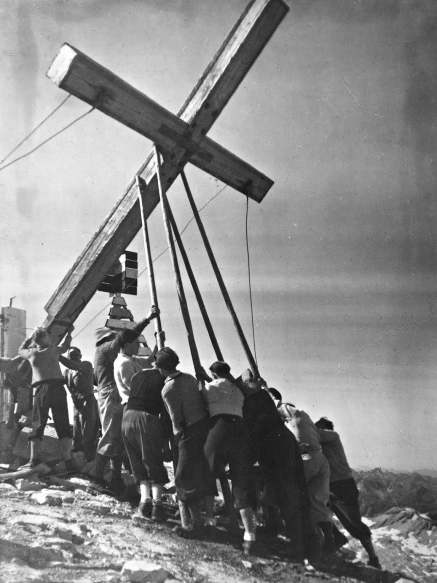 Im September 1920 dann tat sich etwas Ungewöhnliches auf dem Gipfel: Angehörige des Kemptener Gebirgsjäger-Bataillons errichteten zu Ehren der gefallenen Gebirgssoldaten auf dem Hochvogel ein neues, gleich zehn Meter hohes und fünfzehn Zentner schweres Kreuz.